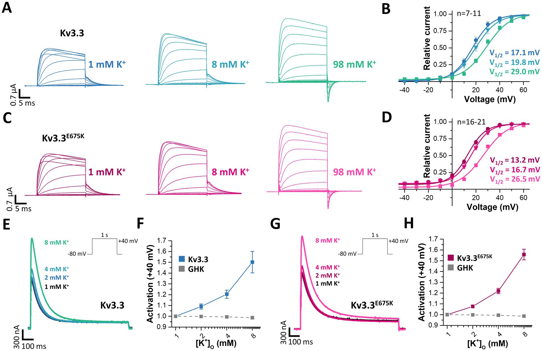 Figure 7. Rescue of Kv3.3 and Kv3.3E675K, by increased peak current amplitudes and reduced channel inactivation, mediated by [K+]ex. (A) Representative conductance-voltage (GV) recordings of Kv3.3 at different [K+]ex and (B) the derived GV relationships, analyzed from the tail currents at different [K+]ex. (C,D) Similar as in panel (A,B) but for the Kv3.3E675K variant. The voltage protocol is illustrated in Supplementary Figure 5A with a step to −15mV, −25mV and −40 mV, respectively. (E) A voltage step from −80 to +40 mV (see inset) was applied to record channel activation and peak currents of wild-type Kv3.3 at different [K+]ex. (F) Analysis of wild-type Kv3.3 channel activation at +40 mV by different [K+]ex. As a comparison to illustrate the paradoxical Kv3.3 activation by [K+]ex, the expected current changes, according to the Goldmann-Hodgkin-Katz equation, are illustrated as dotted line. (G,H) Similar as panel (E,F) but for the Kv3.3E675K variant. Data are presented as mean ± s.e.m. The number of replicates is indicated within the graphs. |