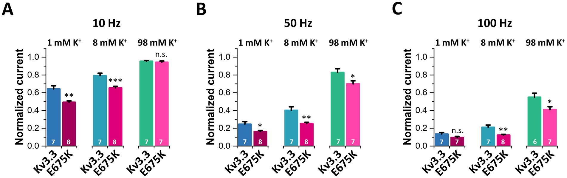Figure 9. Analyses of the frequency-dependent accumulation of inactivation for Kv3.3 and Kv3.3E675K at different frequencies and [K+]ex. The data were analyzed from recordings illustrated in Figure 8. Relative current amplitudes after 10 s of pulsing at different [K+]ex (1 mM, 8 mM, 98 mM) at 10 Hz (A), 50 Hz (B) and 100 Hz (C). The current was normalized to the amplitude of the first pulse. Data are presented as mean ± s.e.m. The number of replicates is indicated within the graphs. |