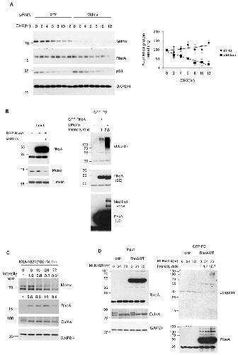 Figure 2. Mdmx degradation induced upon NEDDylation inhibition requires inactive Cullin4A and Mdm2. (A) A375 cells were co-transfected with different dominant negative-expressing Flag-tagged Cullin constructs (3 μg) and HA-Mdmx (3 μg). After 48 h post-transfection, total cell extracts were used for Western blotting as indicated. (B) A375 cells were transfected with either control, Cullin4A, or Cullin4B siRNAs followed by MLN4924 treatment (1 μM, 15 h). After 48 h post-transfection, cell extracts were used for Western blotting against the indicated proteins. (C) Experiment performed as in B using Actinomycin D treatment (5 nM, 15 h). (D) A375 cells were transfected with Mdm2-targeting siRNAs and treated as indicated (MLN4924, 1 μM, 15 h), before extracts were analysed by Western blotting using indicated antibodies. (E) A375 cells were treated with MLN4924 (1 μM, 6 h, conditions where Mdmx levels are not significantly affected) and extracts were used for immunoprecipitations using 4B2 anti-Mdm2 antibody. Western blot analysis on immunoprecipitates and total cell extracts was performed with the indicated antibodies.
