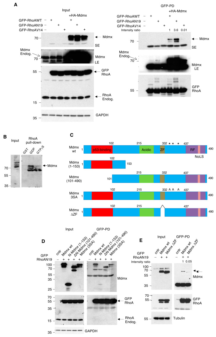 Figure 6. Mdmx interacts with the inactive GDP form of RhoA through its Zn finger domain. (A) A375 cells were transfected with GFP-tagged RhoA constructs (3 μg) and HA-Mdmx (3 μg) as indicated. After 24 h post-transfection, extracts were used for GFP trap pull-downs (PD) before eluates, and total cell extracts were used for Western blot analysis. SE: Short exposure, LE: Long exposure. (B) Recombinant GST-RhoA loaded in vitro either with GDP or GTPγS was used for pull-down assays with A375 cell extracts. Eluates and total cell extracts were used for Western blot analysis. (C) Schematic representation of the Mdmx protein domains. ZF: Zinc Finger, RF: Ring Finger, NoLS: nucleolus localisation signal-adapted from [56]. The * indicate the phosphorylation sites S342/S367/S403 mutated into Alanine (3SA Mdmx mutant). (D) Experiment was performed as in (A) using, instead, the indicated Mdmx constructs and the GFP-RhoAN19 mutant. GFP trap pull-down (PD) eluates and total cell extracts were used for Western blotting. (E) Experiment as in (D) using the wild type and Zn finger (ZF) deletion Mdmx mutant. Arrows indicate the wild type and Zn finger deletion mutant.
