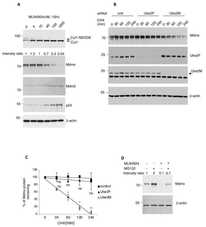 Figure 1. Prolonged inhibition of the NEDD8 pathway promotes Mdmx degradation. (A) A375 melanomas cells were treated with increasing concentrations of the NEDD8 inhibitor MLN4924, and total cell extracts were analysed using Western blotting for the indicated proteins. (B) Half-life experiment for Mdmx in A375 cells upon knockdown of the NEDD8 E2-conjugating enzymes Ube2F and Ube2M using cycloheximide (30 μg/mL). (C) Quantification for the experiment presented in B. Values represent the mean of three independent experiments ± SD. p-values * < 0.05, ** < 0.01 by Student’s t-test. ns: non-significant. (D) A375 cells were treated with MLN4924 (1 μM, 15 h) and MG132 (30 μM, 4 h), and cell extracts were used for Western blotting.