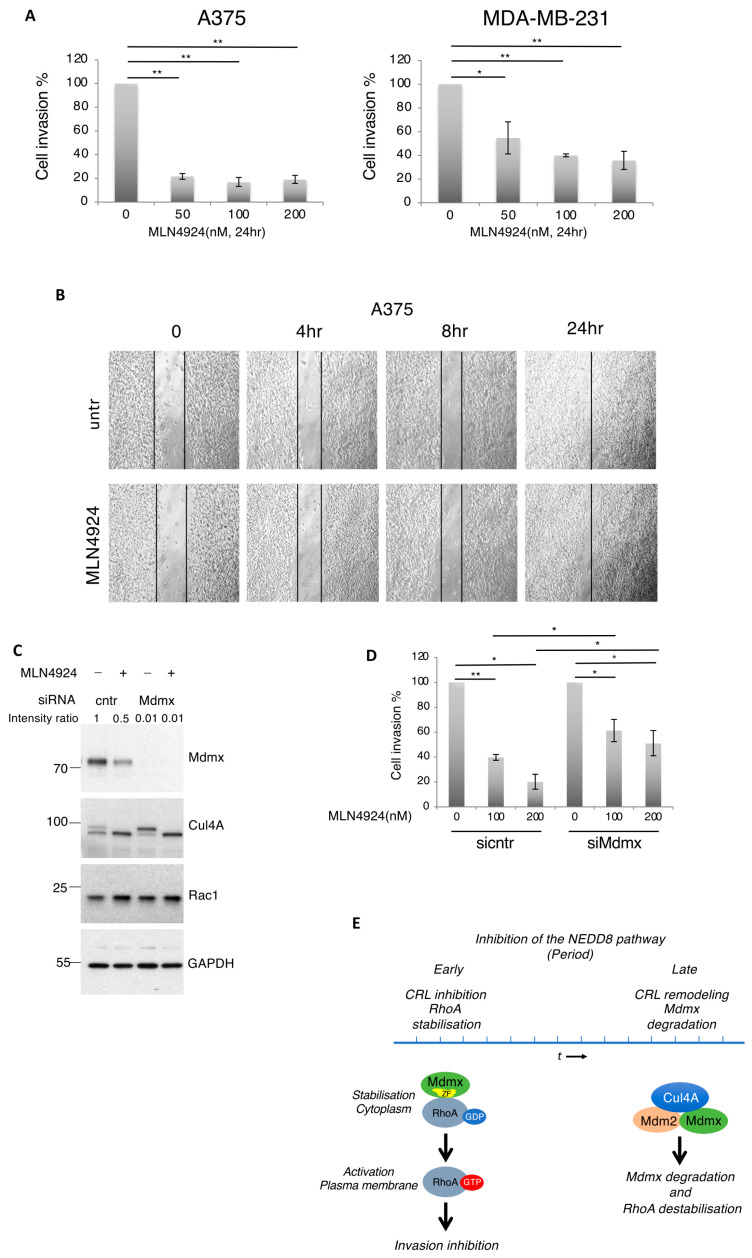 Figure 8. Mdmx prevents cell invasion but not 2D cell migration of metastatic cells. (A) A375 and MDA-MB-231 cells were used in a 3D cell invasion assay and the effect of NEDD8 inhibition was tested as described in Materials and Methods. Values represent the mean of 4 independent experiments ± SD. p-values * < 0.05, ** < 0.01 by Student t-test. (B) Similar experiment was performed to test the effect of NEDD8 inhibition (MLN4924, 1 μM) on 2D cell migration. Black lines indicate the gap between cells filled over the indicated period of time. (C) A375 cells transfected with control or Mdmx siRNAs were treated with MLN4924 (1 μM, 15 h) as indicated and cell extracts were used for Western blot analysis. (D) Similar experiment as in A, but 36 h prior to MLN4924 treatment, A375 cells were transfected with control or Mdmx siRNAs. Values represent the mean of four independent experiments ± SD. p-values * < 0.05, ** < 0.01 using Student t-test. (E) Transient inhibition of NEDDylation and CRL inactivation results in RhoA stabilisation and activation that depends on Mdmx. Prolonged NEDD8 inhibition allows for the formation of complexes between non-NEDDylated Cullin4A (inactivation of CRL4A) and E3-ligases (Mdm2) that promote the degradation of Mdmx and subsequent destabilisation of RhoA.