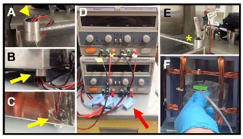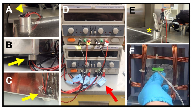 Figure 8. Connecting to the power source.(A) Leads from a Helmholtz coil fed through an upper access port (arrowhead). (B–C) Views of a set of leads fed through a lower access port (yellow arrows), shown from the outside (B) and the inside (C) of the enclosure. (D) Power supplies with attached leads. Red arrow shows axis labeling of each lead. (E) Alligator clip end of ground lead (asterisk) attached to an upper port on the enclosure. (F) Probe end of a milli/Gaussmeter, taped to the stage in the correct orientation for that make of probe, during a test of field strength. |