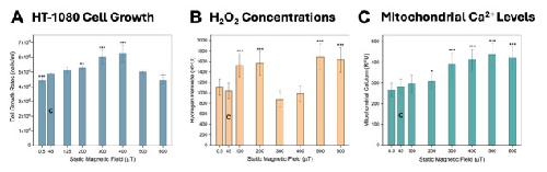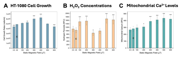 Figure 13. Effects of static magnetic field intensity on fibrosarcoma cells.HT-1080 cell line exposed to a range of 0.5–600 µT static MFs, with 45 µT as controls (“C” bar on graphs), using the modified MagShield apparatus for cell culture in a 37 °C CO2 incubator. (A) Effects on cell growth. Cell growth rates expressed as a function of static MF exposure (mean ± SD) with the fields perpendicular to the flask bottom; n = 12, N = 3 for each group. (B) Effects on hydrogen peroxide (H2O2) levels. H2O2 concentrations as a function of static MF exposure (mean ± SD); n = 63, N = 3 for each group. (C) Effects on mitochondrial calcium (Ca2+) levels. Mitochondrial Ca2+ concentrations as a function of static MF exposure (mean ± SD) for fields oriented at 90° with respect to the plane of the cell flask bottom; n = 63, N = 3 for each group. * p < 0.05, ** p < 0.01, and *** p < 0.001. Error bars = standard deviation (SD). |