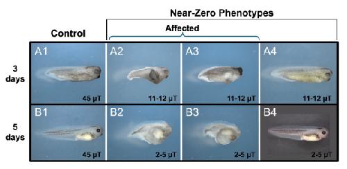 Figure 14. Preliminary developmental phenotypes from hypomagnetic field exposure of Xenopus larvae.Embryos exposed to either 45 µT (controls) or near-zero static MFs using the modified MagShield apparatus for hypomagnetic fields at 20 °C (room temperature). (A) Trial run 1: phenotypes at 3 days of development. (A1) Controls, phenotype n = 28/28. (A2-3) Near-zero affected phenotypes at 11–12 μT: Stunted growth with defects in anterior structures and anterior-posterior (AP) axis formation; n = 2/29. (A4) Representative phenotype of 11–12 μT animals with normal appearance. (B) Trial run 2: phenotypes at 5 days of development. (B1) Controls, phenotype n = 30/30. (B2-3) Near-zero affected phenotypes at 2–5 μT: Continued stunted growth with defects in anterior structures and AP axis formation; n = 3/30. (B4) Representative phenotype of 2–5 μT animals with normal appearance. Anterior is to the right and dorsal is up. |