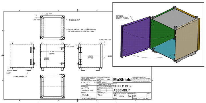 Figure 1. Schematic for MagShield apparatus enclosure.Schematic diagrams for constructing the 16 × 16 × 16 in enclosure out of 0.125 in thickness mu-metal. See Supplemental File S2 for complete details. |
