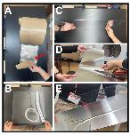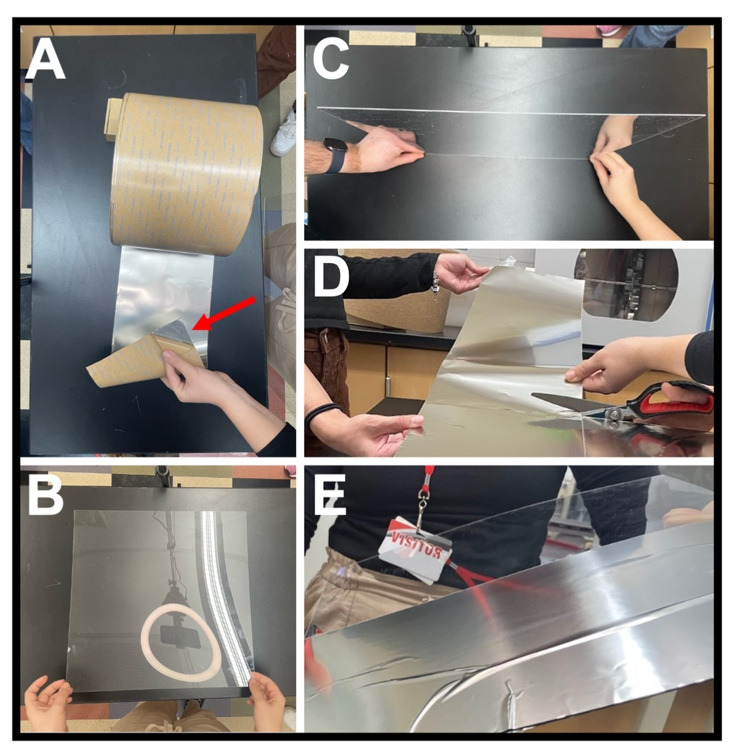 Figure 3. Constructing the mu-metal partition.(A) Mu-metal foil showing a corner where the adhesive packing is peeled off (arrow). (B) Plexiglass sheet. (C) View of Plexiglass sheet thickness 1/8 in (3.175 mm). (D) Cutting the mu-metal foil with adhesive backing into 16 in lengths. (E) First 16 in strip of foil attached to half of the Plexiglass sheet. |