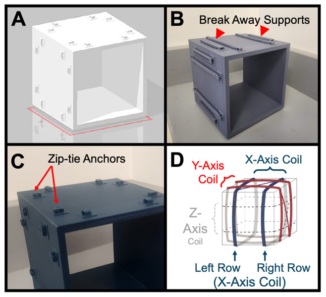 Figure 5. Helmholtz coil anatomy.(A) 3D model of the base frame. (B) Actual 3D printed base frame, with breakaway supports (arrowheads) still attached. (C) Close-up of the 3D printed base frame with breakaway supports removed. Note the raised zip-tie anchors (arrows) for correct positioning of coil rows and wire management. (D) Diagram of 3-axial Helmholtz coil showing the three coil pairs for the three axes (x in blue, y in red, and z in grey). |