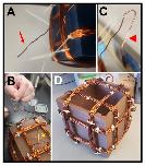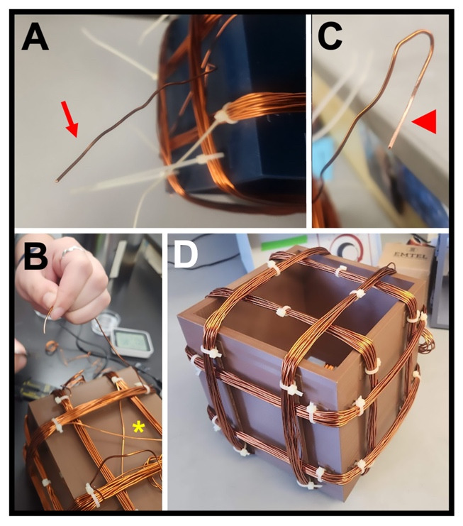 Figure 6. Winding the coils.(A) Free end of the copper wire (arrow) for one coil, where 4 in (~10 cm) of wire is left unwound at each end for attaching to the power supply. (B) View of one face of a completed coil, showing the crossing of the copper wire (asterisk) between the left and right coil pairs. (C) Free end of one coil, showing the stripped insulation (arrowhead) required for a strong connection to the power supply lead. (D) Completed Helmholtz coil with three coil pairs (x, y, and z) that have been zip-tied (white clasps) to the base frame via the anchors and had the zip-tie “tails” cut off. |
