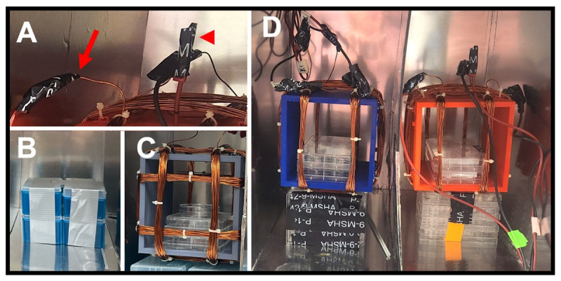 Figure 7. Placement of the coils, samples, and leads.(A) The alligator clip end of a red lead is attached to the exposed end of one coil pair (arrow). The alligator clip of a black lead is attached to the other end of that same wire (middle of image). To ensure a good connection, secure the clip to the wire with electrical tape (arrowhead). (B) A taped stack of used pipette tip boxes is used to position the Helmholtz coil in the center of each partition. (C) A complete Helmholtz coil with a stack of used plasticware (welled plates) to position the samples (Petri dish) in the center of the coil base frame. (D) Final positioning of both Helmholtz coils, one in each partition. Note in the lower-right corner where a pair of red and black leads clipped to each end of a single coil pair have been taped together (green tape). |