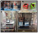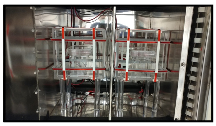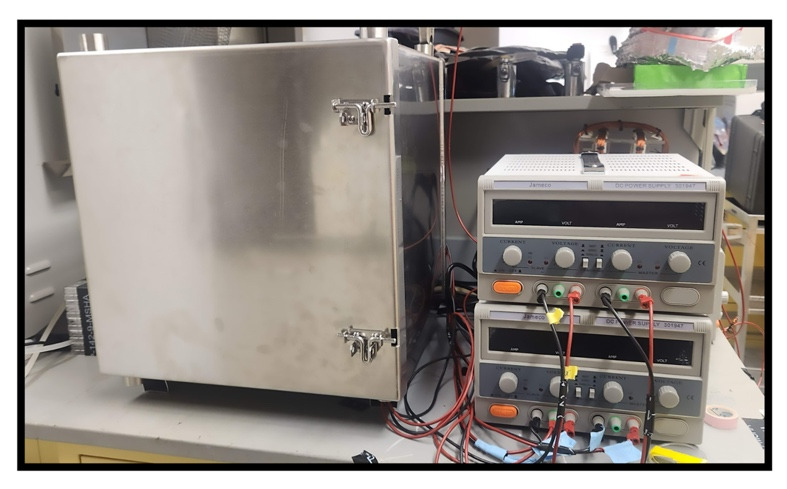 Figure 10. Modified MagShield setup for cell culture.View of MagShield apparatus inside a carbon dioxide (CO2) incubator used for cell culture, as previously reported [17]. This modification is required to maintain specific temperature, humidity, and gas composition needed to support the growth of cells in culture. Modifications include additional environmental sensors and considerations to prevent gas leaks while accommodating lead access to the power supplies. |