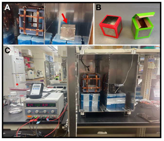 Figure 11. Hypomagnetic field exposure setup.(A) Interior of MagShield apparatus showing a Helmholtz coil in the left partition for Earth-normal controls, and an additional mu-metal-covered container for “near-zero” (< ~10 μT) hypomagnetic fields in the right partition (red arrow). (B) Mu-metal covered near-zero containers shown with tape covering sharp edges. (C) Photo of the hypomagnetic field exposure setup, with a single power supply and Helmholtz coil for controls, and additional mu-metal container for near-zero experiments. |