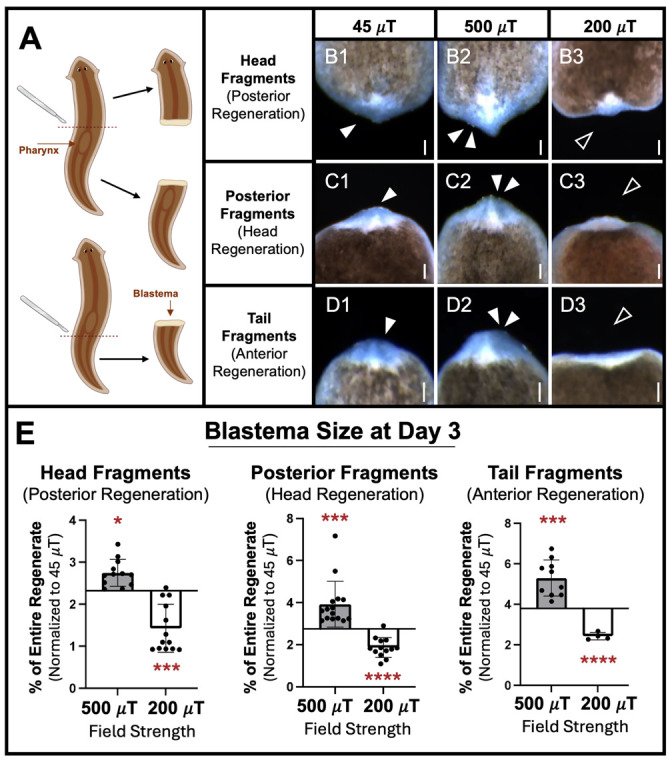 Figure 12. Effects of static magnetic fields on planarian regeneration.Regenerating fragments analyzed for blastema size (new tissue growth, visualized as the white region at the wound site) after three days of exposure to 500 µT (activating), 200 µT (inhibiting), or 45 µT (control) field strengths, using the MagShield apparatus as described in this protocol at 20 °C (room temperature). (A) Diagram of cuts. Adult planarians were transected by scalpel at one of two different amputation planes (dotted red lines), one above and the other below the pharynx (feeding tube), producing three different fragment types. (B) Head fragments, regenerating their pharynx and tail. (C) Posterior fragments, regenerating their head. (D) Tail fragments, regenerating their pharynx and head. (E) Quantification of B–D. Anterior is up. Single solid arrows: control blastema size. Double solid arrows: increased tissue growth. Empty arrows: inhibited tissue growth. Scale bars = 100 µm. n ≥ 5. Error bars = SEM. * p < 0.05, *** p < 0.001, **** p < 0.0001. |