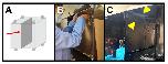 Figure 4. Installing the mu-metal partition.(A) Correct placement (arrow) of the foil-covered Plexiglass sheet, bisecting the mu-metal enclosure. (B) Taping the partition to the enclosure for extra stability. (C) Final installation of the mu-metal partition, showing the tape (arrowheads) connecting the partition to the enclosure. |