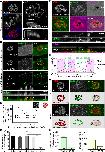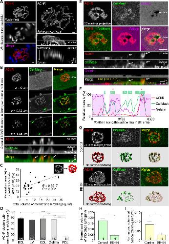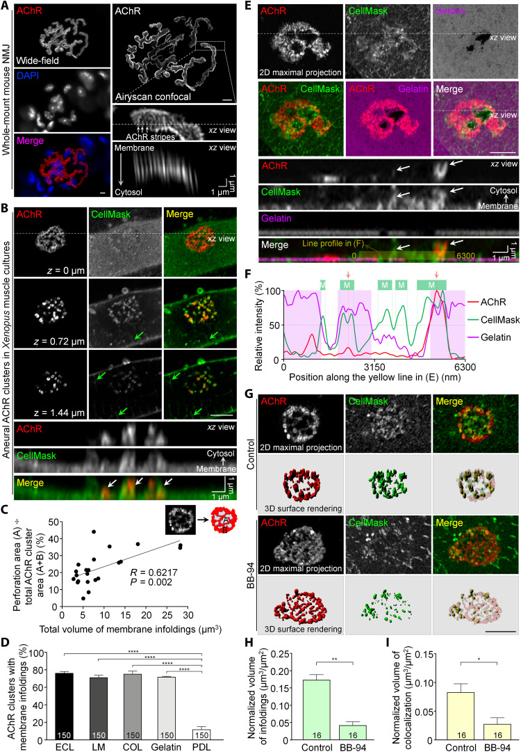 Fig. 1. ECM proteins and their remodeling are required for membrane infolding formation at topologically complex AChR clusters.(A) Airyscan confocal images showing the ultrastructural organization of the postsynaptic apparatus at mature mouse NMJs. Junctional folds are identified as AChR stripes (arrows) in the maximal and xz orthogonal projection images. (B) Different focal planes of Airyscan confocal images showing the association of membrane infoldings with aneural AChR clusters in cultured Xenopus muscle cells. White arrows, spatial colocalization of AChR and membrane infoldings; green arrows, T-tubules. (C) A scatter plot showing the correlation between the perforated area of AChR clusters and the total membrane infolding volume. (D) Quantification showing the percentage of aneural AChR clusters with membrane infoldings in muscle cells cultured on different substrates. LM, laminin; COL, collagen. (E) Representative confocal z-stack images showing the spatial association of membrane infolding and ECM degradation at aneural AChR clusters. Arrows, AChR localization at membrane infoldings; yellow line, line profile generation in (F). (F) A line profile showing the relative intensities of AChR, CellMask, and fluorescent gelatin along the yellow line in (E). Shaded regions were highlighted by a 50% cutoff intensity. Red arrows mark AChR peaks. (G) Maximal projection and surface rendering confocal images showing the effects of BB-94 on membrane infolding formation in aneural AChR clusters. (H and I) Quantification showing the effects of BB-94 on the normalized volume of membrane infoldings (H) and the colocalization volume of AChRs and membrane infoldings (I) per unit area of aneural clusters. Scale bars, 5 μm (unless stated otherwise). Data are means ± SEM. The numbers indicated in the bar regions represent the total numbers of muscle cells quantified from three independent experiments. *P ≤ 0.05, **P ≤ 0.01, and ****P ≤ 0.0001 [one-way analysis of variance (ANOVA) with Dunnett’s multiple comparisons test (D) and Student’s t test (H) and (I)]. |