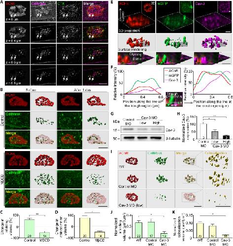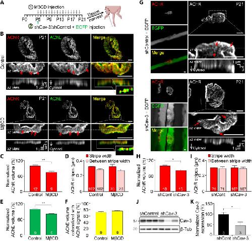 Fig. 7. MβCD treatment or caveolin-3 knockdown inhibits the postnatal development of junctional folds at mouse NMJs in vivo.(A) Experimental timeline for MβCD-mediated lipid raft disruption (gray arrows) or shRNA-mediated caveolin-3 knockdown (green arrow) in the early postnatal development of mouse hindlimb muscles. (B) Airyscan confocal images showing the effects of MβCD on junctional fold development in single muscle fibers isolated at P21. AChE signals mark the entire junctional fold structures. Red arrows, AChR stripes. Insets: Less AChR signals (red) detected at the troughs of AChE-labeled junctional folds (green) in the thresholded images. (C and D) Quantification showing the effects of MβCD treatment on the normalized AChR volume (C) and the width of and the average distance between AChR stripes (D) at NMJs. (E and F) Quantification showing the effects of MβCD treatment on the normalized AChE volume (E) and the percentage of AChE volume colocalized with AChR signals (F) at NMJs. (G) Airyscan confocal images showing the effects of caveolin-3 shRNA on the development of junctional folds in single muscle fibers isolated at P21. EGFP signals: the presence of shControl or shCav-3. Red arrows: AChR stripes. (H and I) Quantification showing the effects of shRNA-mediated caveolin-3 knockdown on the normalized AChR volume (H) and the width of and the average distance between AChR stripes (I) at NMJs. shCont, shControl. (J and K) Western blot analysis (J) and quantification (K) showing the effective knockdown of endogenous caveolin-3 expression in the hindlimb muscles by adenovirus-mediated delivery of shCav-3. β-Tubulin (β-Tub) was used as the loading control. Scale bars, 5 μm (unless stated otherwise). Data are means ± SEM. The numbers indicated in the bar regions represent the total numbers of NMJs (C), (E), (F), and (H) and AChR stripes (D) and (I) measured from three animals per experimental group. *P ≤ 0.05 and **P ≤ 0.01 (Student’s t test). |