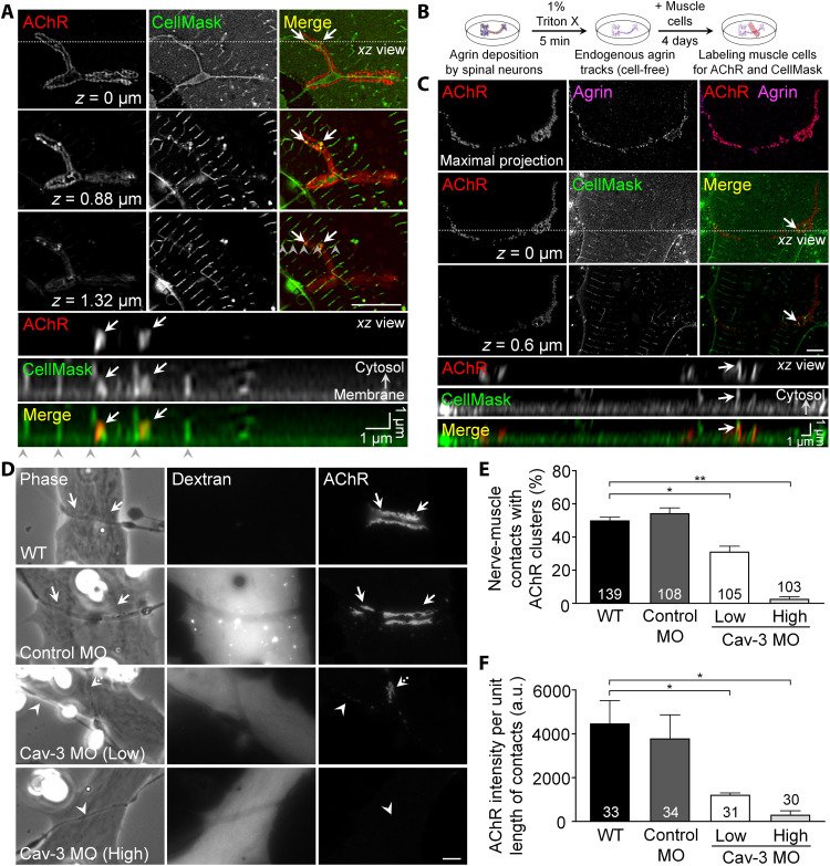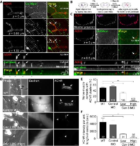 Fig. 5. Caveolin-3 knockdown inhibits the formation of nerve-induced synaptic AChR clusters with membrane infoldings.(A) Different focal planes of Airyscan confocal z-stack images showing the presence of membrane infoldings associated with synaptic AChR clusters in nerve-muscle co-cultures. Z values indicate the vertical distance from the basal muscle surface. Arrows indicate the spatial colocalization of AChR clusters and membrane infoldings at nerve-muscle contacts. Arrowheads indicate the sarcolemma invaginations at the T-tubules. (B) Experimental procedures for the preparation of endogenous agrin tracks to induce synaptic AChR clustering in cultured muscle cells. (C) 2D maximal projection and different focal planes of Airyscan confocal z-stack images showing the presence of membrane infoldings associated with AChR clusters induced by endogenous agrin tracks. Z values indicate the vertical distance from the basal muscle surface. Arrows indicate the spatial colocalization of AChR clusters and membrane infoldings. (D) Representative images showing a dose-dependent effect of muscle caveolin-3 knockdown on nerve-induced AChR clustering. Fluorescent dextran signals indicate the presence of MO in muscle cells. Arrows indicate synaptic AChR clusters at nerve-muscle contacts. Arrowheads and a dashed arrow indicate no and reduced AChR clusters at the nerve-muscle contacts, respectively. (E and F) Quantification showing the effects of muscle caveolin-3 knockdown on the percentage of nerve-muscle contacts with AChR clusters (E) and AChR intensity per unit length of nerve-muscle contacts (F) in the chimeric co-cultures. Scale bars, 5 μm (unless stated otherwise). Data are means ± SEM. The numbers indicated in the bar regions represent the total numbers of nerve-muscle contacts measured from four (E) or three (F) independent experiments. *P ≤ 0.05 and **P ≤ 0.01 (one-way ANOVA with Dunnett’s multiple comparisons test). a.u., arbitrary units. |
