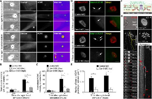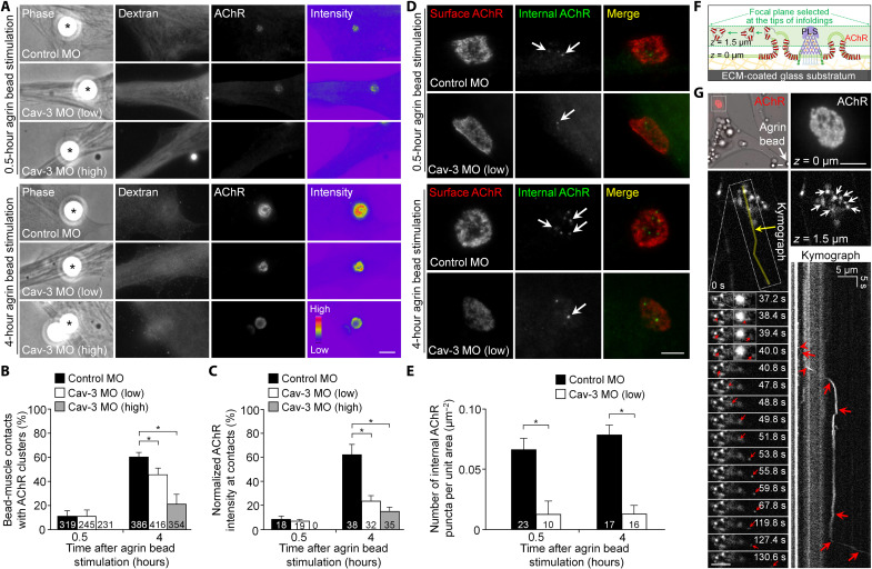 Fig. 6. Caveolin-3 knockdown delays agrin-induced AChR clustering by attenuating AChR endocytosis at aneural clusters.(A) Representative images showing the effects of caveolin-3 knockdown on agrin bead–induced AChR clustering upon 0.5- or 4-hour stimulation. Fluorescent dextran signals indicate the presence of MO in muscle cells. 8-bit pseudocolor images highlight the relative fluorescence intensity of agrin bead–induced AChR clusters under different conditions. (B and C) Quantification showing the effects of caveolin-3 knockdown on the percentage of bead-muscle contacts with AChR clusters (B) and the normalized fluorescence intensity of bead-induced AChR clusters (C). (D and E) Representative images (D) and quantification (E) showing the effects of low caveolin-3 knockdown on AChR internalization at aneural clusters upon agrin bead stimulation. Arrows indicate internalized AChR vesicles at aneural clusters. (F) Schematic diagram illustrating the experimental approach for visualizing and tracking the formation of AChR-containing vesicles at membrane infoldings within ECM-induced aneural AChR clusters by adjusting the focal plane of high-speed time-lapse imaging at ~1.5 μm above the basal muscle membrane. (G) Representative time-lapse images capturing the formation of AChR-containing vesicles (red arrows) derived from the tip of membrane infoldings (red arrowheads) in agrin bead–stimulated muscle cells. A kymograph was constructed along the indicated yellow line that shows the initial formation of AChR vesicles from membrane infoldings at aneural AChR clusters, followed by directional movement toward the location of agrin bead stimulation. White arrows, the tip of membrane infoldings detected at the specified focal plane. The time-lapse video, movie S1, is available in the Supplementary Materials. Scale bars, 5 μm. Data are means ± SEM. The numbers indicated in the bar regions represent the total numbers of bead-muscle contacts (B) and (C) and bead-contacted muscle cells (E) measured from four (B) and (C) and three (E) independent experiments, respectively. *P ≤ 0.05 (one-way ANOVA with Dunnett’s multiple comparisons test). |