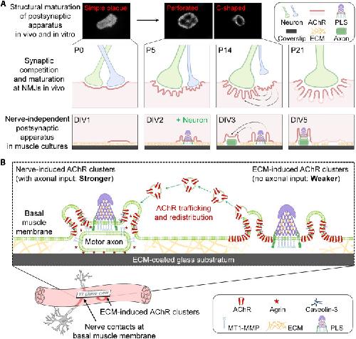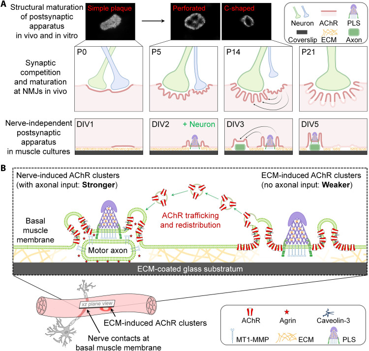 Fig. 8. Proposed roles of membrane folds in regulating AChR trafficking and redistribution during the maturation of topologically complex postsynaptic apparatus in muscle cultures and at NMJs in vivo.(A) Topological changes of the postsynaptic apparatus from simple oval plaques to more elaborated perforated and C-shaped are observed in both ECM-induced AChR clusters in muscle cultures and mouse NMJs during postnatal development. Within the first three postnatal weeks (P0 to P21) in mice, the elimination of inactive axonal inputs occurs at the polyneuronally innervated muscle fibers, leading to singly innervated muscle fibers. Meanwhile, the structural maturation of postsynaptic apparatus occurs at active NMJs, as evidenced by the formation of junctional folds. In this study, we observed that membrane infoldings are progressively formed at ECM-induced AChR clusters in the basal membrane of cultured muscle cells during the first 5 days in vitro (DIV). Upon nerve innervation, AChRs are redistributed from aneural clusters to nascent nerve-muscle contact sites through intracellular trafficking of AChR vesicles derived from the membrane infoldings. This process mirrors the redistribution of postsynaptic proteins from inactive to active NMJs during synapse elimination and maturation in postnatal development of mammalian NMJs. (B) In Xenopus nerve-muscle co-cultures, we found that lipid rafts and caveolin-3 play a crucial role in regulating extensive membrane infolding formation at PLS-localized AChR-poor perforations of aneural and nerve-induced AChR clusters. Similar to the mature NMJs in vivo, vesicular trafficking of AChR molecules is observed at AChR clusters in muscle cultures, where synaptogenic stimulation may hijack the trafficking of AChR vesicles to promote the assembly of nerve-induced synaptic AChR clusters (dashed arrows). Together, this study provides compelling evidence to support the long-standing hypothesis that topological maturation of nerve-independent ECM-induced aneural AChR clusters in muscle cultures mirrors that of the postsynaptic apparatus at mature mammalian NMJs in vivo. |