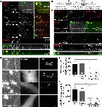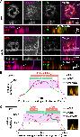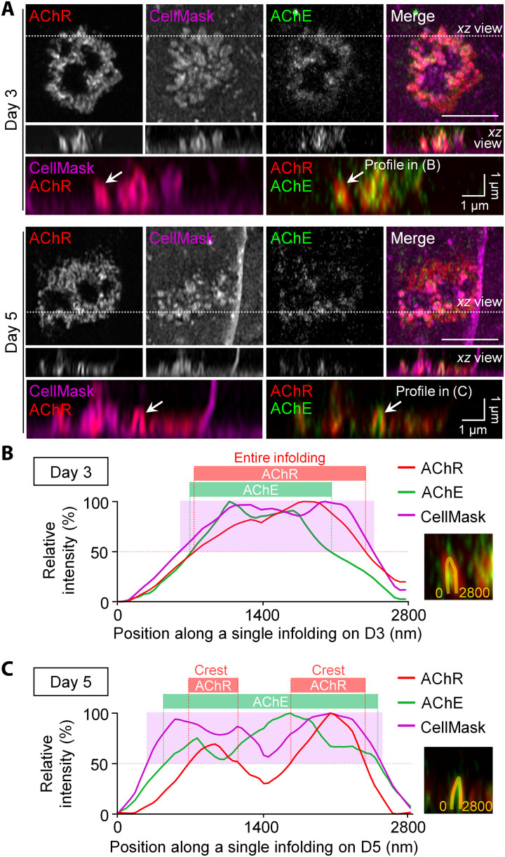 Fig. 3. Time-dependent elongation of membrane infoldings exhibits differential localization of AChR and AChE along the length of membrane infoldings.(A) Maximal and orthogonal projection of Airyscan confocal z-stack images showing the spatial enrichment of AChE along the entire membrane infolding region at aneural AChR clusters in both 3- and 5-day-old live muscle cells. Arrows, the spatial distribution of AChR and AChE along the CellMask-labeled membrane infoldings in the orthogonal views. (B and C) Line profile plots showing the relative intensities of AChR (red), AChE (green), and CellMask (magenta) signals at aneural AChR clusters in 3- (B) and 5-day-old (C) muscle cells. The spatial distribution of AChR and AChE along the CellMask-labeled membrane infolding was highlighted in shaded regions by a 50% cutoff intensity. Yellow lines in the insets indicate the regions of interest (ROIs) for generating line profiles. Scale bars, 5 μm (unless stated otherwise). |