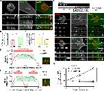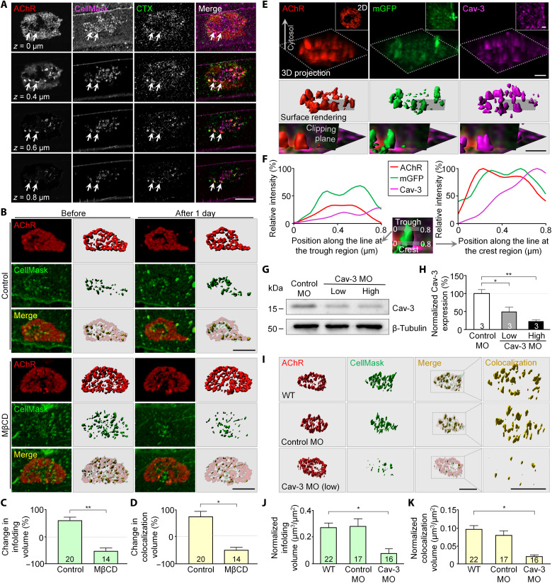 Fig. 4. Lipid rafts and caveolin-3 regulate membrane infolding formation and maintenance at aneural AChR clusters.(A) Different focal planes of Airyscan confocal images showing CTX-labeled lipid rafts at aneural AChR clusters (arrows). (B) Representative 3D and surface rendering images showing the effects of MβCD treatment on membrane infolding formation and maintenance. For clarity, only signals at aneural AChR clusters were included in the surface rendering images. (C and D) Quantification showing the effects of MβCD treatment on the percentage changes in membrane infolding volume (C) and colocalization volume of AChRs and membrane infoldings (D) after 1 day. (E) Representative images showing the spatial localization of endogenous caveolin-3 at membrane infoldings. Insets: 2D maximal projection images. Bottom row: The magnified view of different markers in a clipping (dark vertical) plane to better visualize a single-membrane infolding. (F) Line profile plots showing the spatial enrichment of AChR and caveolin-3 at the crest (right chart), but less at the trough (left chart), regions along a single mGFP-labeled membrane infolding. (G and H) Western blot analysis (G) and quantification (H) showing the effective knockdown of endogenous caveolin-3 expression by antisense caveolin-3 MO. (I) Representative images showing the effects of caveolin-3 knockdown on the formation of membrane infoldings. 2D maximal projection images are included in fig. S9B. (J and K) Quantification showing the normalized volume of membrane infoldings (J) and colocalization volume of AChRs and membrane infoldings (K) per unit area of aneural clusters. Scale bars, 5 μm (A), (B), and (I) or 1 μm (E). Data are means ± SEM. The numbers indicated in the bar regions represent the total numbers of muscle cells (C), (D), (J), and (K) or blots (H) quantified from three independent experiments. *P ≤ 0.05 and **P ≤ 0.01 [Student’s t test (C) and (D) and one-way ANOVA with Dunnett’s multiple comparisons test (H), (J), and (K)]. |