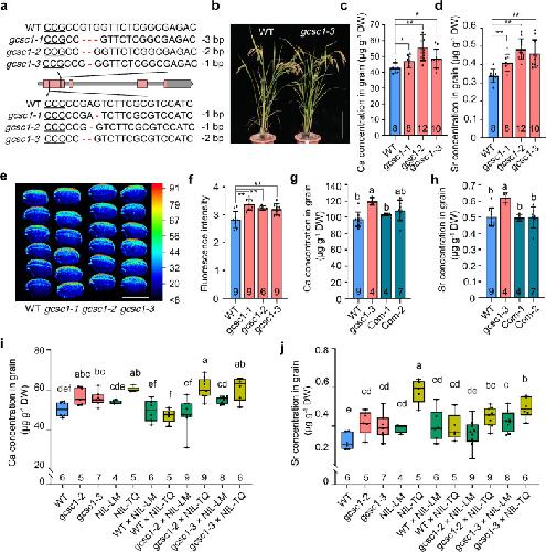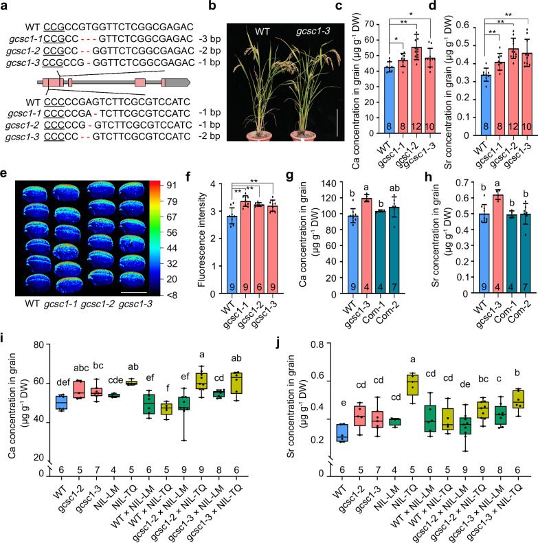 Fig. 2. Characterization of the gcsc1 mutants and complementation test.a Knockout mutants of GCSC1 generated by CRISPR/Cas9 genome editing technology. Two gRNA targets are indicated with vertical lines. PAM sits are underlined. Deletions are indicated with red lines. gcsc1-1 is frame shift mutation; gcsc1-2 and gcsc1-3 are premature termination mutants. b The growth phenotype of WT and gcsc1-1 grown in a paddy field at harvesting stage. Bar, 25 cm. The concentrations of Ca (c) and Sr (d) in the grains of WT and gcsc1. e X-ray fluorescence (XRF) scanning the grains of WT and gcsc1. The red and blue colors represent high and low Ca concentration, respectively. Bar, 5 mm. f Quantification of the fluorescence intensity of XRF images in (e). g, h Transgenic complementation of gcsc1 by transforming the cDNA of GCSC1 from LM and expressed under the control of its native promoter. Grain Ca (g) and Sr (h) concentration of WT, gcsc1, and two independent complemented lines were determined. i Genetic complementation of gcsc1 by crossing with NIL(TQ) or NIL(LM). The Ca (i) and Sr (j) concentrations in the grains of WT, gcsc1, NIL(TQ), NIL(LM), and F1 plants were determined. Data in (c, d, f–h) are presented as mean ± SD with indidated biological replicates. Data in (i–j) are shown as boxplots displaying the maximum and minimum, first and third quantiles, and the median. The number below each box indicates the number of biological replicates. Statistical significance was determined by two-sided Student’s t-test (c, d, f) or Fisher’s least significant difference (LSD) test (g–j). *p ≤ 0.05; **p ≤ 0.01; Different letters above the bars in (g–j) indicate significant difference at p ≤ 0.05. DW, dry weight. Source data are provided as a Source Data file. P values detailed in Source data. |