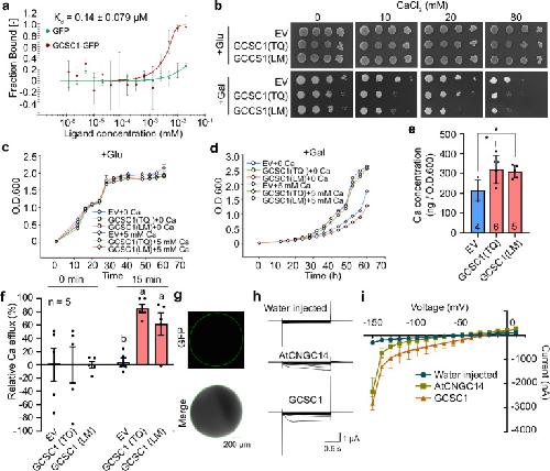 c, d Growth curves of various yeast strains in the liquid Glu (c) or Gal (d) media supplied without or with 5 mM CaCl2. The O.D.600 was measured at indicated times. The growth curves of yeast strains transformed with GCSC1 from TQ and LM were almost identical and were overlapped in (d). e Ca concentrations in yeast cells transformed with EV or GCSC1 from TQ or LM. Data in (a, c–e) are presented as mean ± SD (n = 3 biological replicates). * indicates significant differences between EV and GCSC1 at p ≤ 0.05 (two-sided Student’s t-test). f Ca2+ transport activity of GCSC1 in everted membrane vesicles of E. coli BL21 strain transformed with EV or GCSC1 from TQ or LM. The Ca concentrations in everted membrane vesicles were determined at 0 and 15 min after incubation, and the Ca2+ efflux relative to time point 0 was calculated. Data are presented as mean ± SE (n = 5). Different letters indicate significant differences p ≤ 0.01 (Fisher’s LSD test). g Plasma membrane localization of GCSC1-GFP in Xenopus oocytes. h, Two-electrode voltage-clamp characterization of GCSC1 in Xenopus oocytes. AtCNGC14 expressed oocytes were used as positive control and water-injected oocytes showing background currents were used as negative control. The currents were recorded in a bath solution containing 20 mM CaCl2 by a stepwise mode. i, Steady-state current-voltage (I-V) relationships of recordings as in (h). Data are presented as mean ± SE with four biological replicates. Source data are provided as a Source Data file. P values detailed in Source data. |