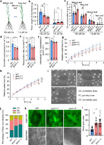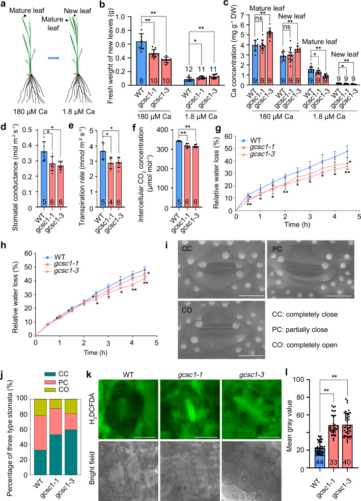 Fig. 7. Knockout of GCSC1 alters Ca allocation in rice.a Diagram showing the treatment of WT and gcsc1 under Ca sufficient (180 μM) or limited (1.8 μM) conditions. Five-leaf-old plants grown hydroponically in nutrient solution containing 180 μM Ca were kept growing or treated with 1.8 μM Ca until a new leaf fully emerged. b Fresh weight of new leaves of WT and gcsc1 plants grown hydroponically as described in (a). c Ca concentrations in the mature and new leaves of WT and gcsc1 plants grown under Ca sufficient or limited conditions. d–f The stomatal conductance (d), transpiration rate (e), and intercellular CO2 concentration (f) on flag leaves of WT and gcsc1 at grain filling stage. g, h, The relative water loss in the flag leaves of WT and gcsc1 at grain filling stage (g) or in the second fully expanded leaves of four-week-old plants grown hydroponically (h). i, Environmental scanning electron microscopy images of three levels of stomatal opening. Bar, 10 µm. j The percentage of three levels of stomatal opening in WT and gcsc1. k Examination of H2O2 accumulation in the guard cells of WT and gcsc1 by staining with a fluorescence dye H2DCFDA. Bar, 10 mm. l Quantitative analysis of the fluorescence intensity of H2DCFDA in the guard cells of WT and gcsc1. Data are presented as means ± SD in (b–j) with n = 9 in (b), 3 in (c, g, h), 6 in (d–f), 42-49 in (j) and 33-44 in (l). * and ** indicate significant differences between WT and gcsc1 at p ≤ 0.05 and p ≤ 0.01, respectively (two-sided Student’s t-test). DW, dry weight. FW, fresh weight. Source data are provided as a Source Data file. P values detailed in source data. |