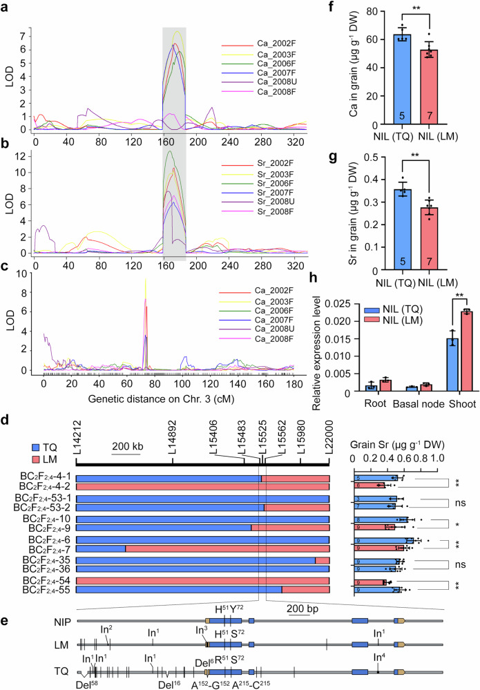 Fig. 1. QTL analysis and map-based cloning of qGCa3 in rice.a–c The LOD profiling of qGCa3 on chromosome 3 in the LT-RIL population grown in multiple years under different conditions. QTL analyses were performed based on grain Ca (a, c) or Sr (b) concentration by using RFLP markers (a, b) or SNPs (c) derived from whole genome resequencing. F flooded; U unflooded. d Fine mapping of qGCa3. The grain Sr of BC2F2;4 plants of six recombinants and the corresponding control lines were determined. e Gene structure and sequence variation of GCSC1 among Nipponbare (NIP), two parental lines “Lemont“(LM) and “TeQing” (TQ). Blue bars, exons; orange bars, untranslated regions; black bar, insertion; vertical lines, SNPs; In insertion; Del deletion. The concentrations of Ca (f) and Sr (g) in grains of two NILs. NIL(TQ), NIL with genotype as TQ; NIL(LM), NIL with genotype as LM. Data in (d, f–h) are presented as mean ± SD with indicated biological replicates. h Expression level of GCSC1 in the root, basal node, and shoot of NIL(TQ) and NIL(LM). Data was presented as mean ± SD with three biological replicates with three plants in each replicate. * and ** in (d, f, g) indicates significant difference at p ≤ 0.05 and p ≤ 0.01, respectively (two-sided Student’s t-test). ns, no significant difference. DW, dry weight. Source data are provided as a Source Data file. P values detailed in Source data. |