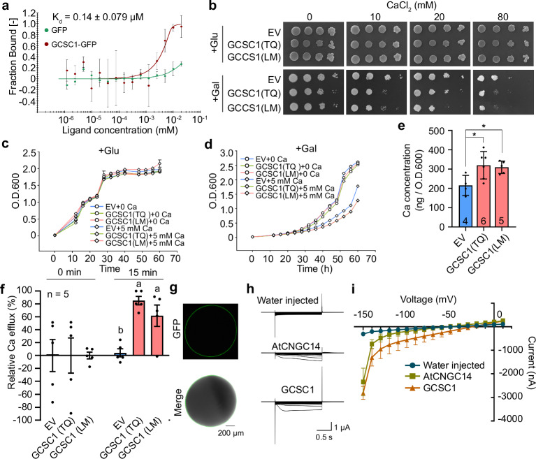 Fig. 4. Ca2+ binding and transport activity of GCSC1.a Determination of the binding activity of GCSC1 to Ca2+ using microscale thermophoresis. The GCSC1-GFP or GFP protein was purified from UBIpro::GCSC1-GFP or UBIpro::GFP transgenic plants, respectively, and then mixed with various concentrations of CaCl2 (ligand). b Ca2+ transport activity of GCSC1 in yeast. The yeast mutant k667 transformed with empty vector (EV) or GCSC1 from TQ or LM were serially diluted and spotted on the media containing glucose (Glu) or galactose (Gal) as carbon source and supplied with various concentrations of CaCl2.