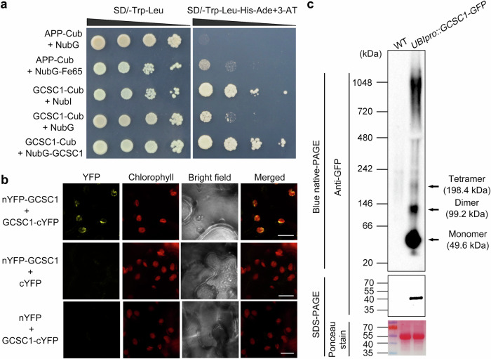 Fig. 6. Determination of self-interaction and oligomerization of GCSC1.a Self-interaction of GCSC1 determined by split-ubiquitin based yeast two-hybrid analysis. The 1:10 serial dilutions of yeast cells transformed with indicated plasmids were spotted on control medium (left) or selective medium (right). APP and Fe65 proteins were used as positive control. b Bimolecular fluorescence complementation assay (BiFC) showing self-interaction of GCSC1 on chloroplast. The N-terminal (nYFP) or C-terminal split YFP (cYFP) were in-frame fused with GCSC1, respectively, and were co-expressed in N. benthamiana leaf epidermis cells. Representative confocal images were shown. Bar, 10 µm. c Determining the oligomerization of GCSC1 by BN-PAGE. Total proteins extracted from WT or UBIpro::GCSC1-GFP transgenic line were resolved by BN-PAGE (upper panel) under nondenaturing condition and then immunoblotted with anti-GFP antibody. The loading control was defined by staining the Rubisco using Ponceau S stain. Approximate molecular weights (kDa) are shown on the left. The arrows on the right denote the putative oligomers of GCSC1-GFP fusion protein with indicated molecular weights. Source data are provided as a Source Data file. |