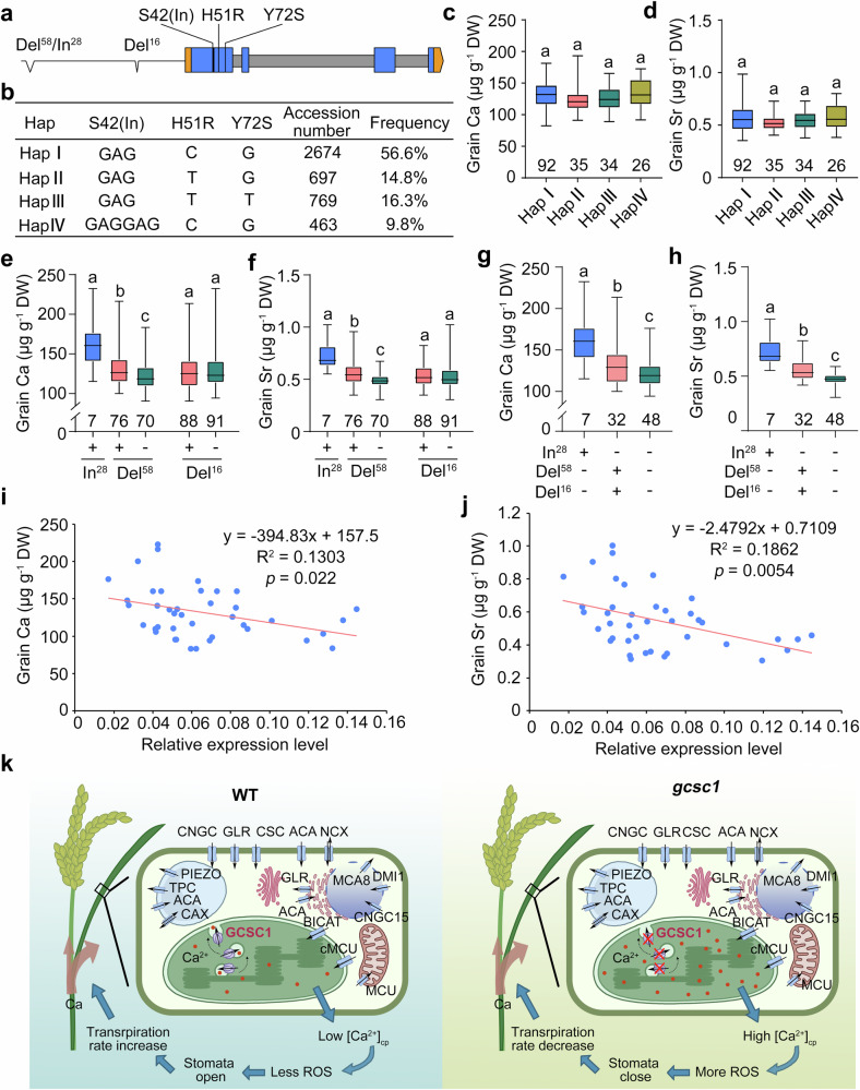 Fig. 8. Contribution of allelic variation of GCSC1 on the variation of grain Ca/Sr concentrations and the proposed working model.a The polymorphic sites in the promoter or coding region of GCSC1 among natural rice accessions. Del15, 58-bp deletion; In29, 28-bp insertion; Del16, 16-bp deletion; S42(In), Ser insertion at position 42. b Haplotype analysis on the coding sequence of GCSC1 in 2956 rice accessions. Grain Ca (c, e, g) and Sr (d, f, h) concentrations in rice accessions with different haplotypes in the coding region (c, d), with or without the indicated indel in the promoter region (e, f), or with different promoter haplotypes derived from the combination of three indels in the promoter (g, h). Data in (c–h) are shown as boxplots displaying the maximum and minimum, first and third quantiles, and the median. The numbers under the boxes are the accession number; different letters above the boxes indicate significant differences at p ≤ 0.05 (Fisher’s least significant difference (LSD) test without adjustment). The correlations of the relative expression of GCSC1 in leaves with the grain Ca (i) or Sr (j) concentrations in 40 rice accessions. The expression of GCSC1 in the leaves of 4-week-old plants was determined by qRT-PCR. DW, dry weight. k The proposed model of GCSC1 in regulation of Ca allocation in rice. The chloroplast vesicle-localized CGSC1 mediates Ca2+ efflux from chloroplasts to cytosol probably by vesicle traffic from thylakoid membrane to the inner envelope membrane (left panel). Knockout of GCSC1 results in elevation of Ca level in chloroplasts which triggers the production of ROS in guard cells and promotes stomatal closure and reduces transpiration rate, and thus promotes more Ca allocation to grains and results in higher Ca level in grains (right panel). The red dots represent Ca2+. Various Ca2+ channels or transporters involved in the Ca2+ fluxes are indicated. Source data are provided as a Source Data file. P values detailed in source data. |