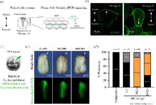 Figure 1. . The role of PCP proteins during vertebrate neurulation, demonstrated using the Xenopus neural plate. (a) NT closure, a crucial developmental event in vertebrate embryos, exemplifies significant cell shape rearrangements. PCP, comprised of two protein complexes, is essential in this process. (b) In the Xenopus neural plate at NF stage 15, the PCP protein Pk2 is polarized anteriorly, while Dvl2 is polarized predominantly posteriorly. (c) Xenopus embryos were microinjected into one dorsal blastomere at the animal pole during the eight-cell stage. (c') In Xenopus embryos with Pk2 and Dvl2 knockdown via morpholino injection into one dorsal blastomere, defects in NT closure are visible in the bright field. The morpholino is detectable in the green channel below. The numbers in the bottom right corner correspond to the amount of embryos with NT defects versus the total amount. White arrows point to the injected side of embryos. (c″) Phenotypic graph of morpholino-injected Xenopus embryos. Most embryos injected with Pk2 morpholino and a significant portion of embryos with Dvl2 morpholino exhibited NT defects, highlighting the key role of both proteins during vertebrate neurulation.