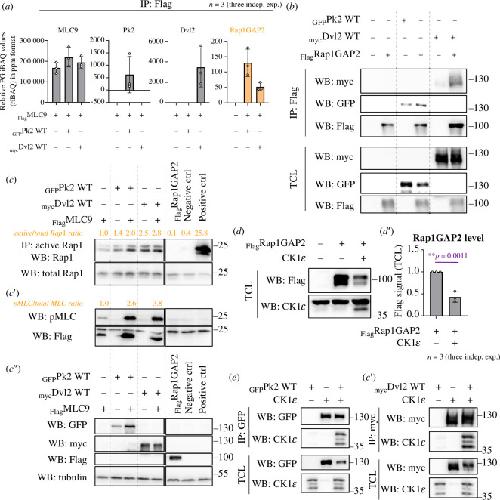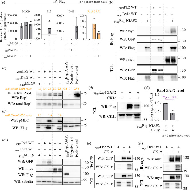 Figure 5. . Both PCP proteins appear to function through the Rap1 small GTPases and CK1ε pathway. (a) Mass spectrometry analysis identifies candidates for MLC phosphorylation induced by Pk2 and Dvl2, with Rap1 GTPase activating protein (Rap1GAP2) emerging as a key candidate that interacts with MLC only in the presence of Pk2 or Dvl2. (b) Co-IP of Pk2, Dvl2 and Rap1GAP2 in MDCK cells demonstrates a physical interaction between PCP proteins and Rap1GAP2. (c) Both Pk2 and Dvl2 increase the total level of Rap1 small GTPase in MDCK cell lysates, suggesting its involvement in this process, as shown through Rap1 activation assay. The Rap1 inhibitor GGTI298 and Rap1GAP2 were used as negative controls for WB signal detection. (d–d′) Casein kinase 1ε (CK1ε) decreases the protein level of Rap1GAP2 in MDCK cells. In (d′), the graph shows results from three independent experiments with statistical significance indicated by a t‐test (**p ≤ 0.01). (e–e′) Co-IP of Pk2 and Dvl2 with CK1ε reveals a physical interaction between both PCP proteins and CK1ε in MDCK cells.