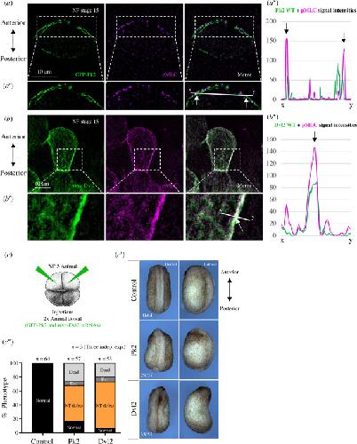 Figure 6. . Both Pk2 and Dvl2 locally induce endogenous pMLC in the Xenopus neural plate and their overexpression causes NT defects. (a–a″). Anteriorly localized Pk2 locally induces pMLC (white arrows) in the Xenopus neural plate, NF stage 15. In (a″), profiles of signal intensities show colocalization of Pk2 and pMLC. (b–b″) Posteriorly localized Dvl2 also colocalizes with induced pMLC in the Xenopus neural plate, NF stage 15. In (b″), profiles of signal intensities show colocalization of Pk2 and pMLC. (c–c″) Overexpression of Pk2 and Dvl2 in Xenopus embryos. In (c), embryos were injected in four-cell stage into two animal dorsal blastomeres with Pk2 or Dvl2 mRNA. (c′) Phenotype of Pk2 and Dvl2 overexpression shows mostly NT defects. The numbers in the bottom right corner correspond to the amount of embryos with NT defects versus the total amount. (c″) A graph of different phenotypes. Most of the embryos with overexpression of Pk2 and Dvl2 suffered from NT defects, highlighting the key role of both proteins during vertebrate neurulation.