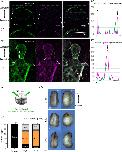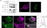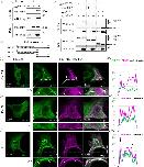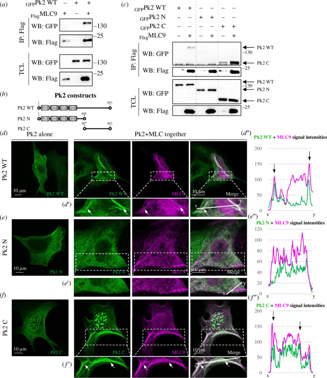 Figure 2. . The C-terminus of Pk2 physically interacts with MLC9. (a) Co-IP of GFP-Pk2 and Flag-MLC9 in MDCK cells shows their physical binding in the MDCK cell lysate. (b) A scheme of the used Pk2 deletion constructs. (c) Co-IP of N- and C-terminal Pk2 constructs with MLC9 shows that the C-terminus of Pk2 is responsible for the interaction with MLC in the MDCK cell lysate. (d–f) IF of Pk2 constructs and MLC9 in MDCK cells shows colocalization of Pk2 WT and C-terminus with MLC in cells and their recruitment into fibre-like structures (white arrows). The scale bar is on the left bottom. (d′–f′) Regions of interest with the lines where the intensity profiles were measured. (d″–f″) Profiles of signal intensities show a colocalization of Pk2 WT and C-terminal with MLC9.