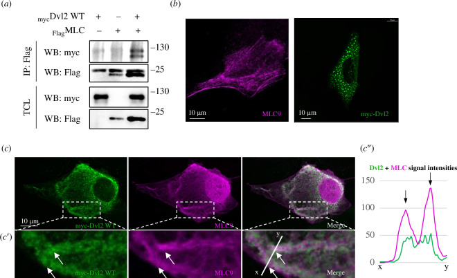Figure 3. . Dishevelled (Dvl) also physically interacts with MLC9. (a) Co-IP of myc-Dvl2 and Flag-MLC9 in MDCK cells shows their physical binding in the cell lysate. The upper signal in IP: Flag, WB: Flag is non-specific. (b) Subcellular localization of MLC9 and Dvl2 alone in MDCK cells. (c) IF of Dvl2 constructs and MLC in MDCK cells shows that Dvl2 interacts with MLC9 in cells and they both colocalize in fibre-like structures (white arrows). The scale bar is on the left bottom. (c′) Region of interest with a line where the intensity profile was measured. (c″) Profiles of signal intensities show the colocalization of Dvl2 and MLC9.