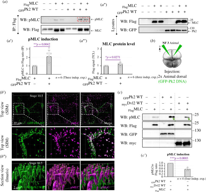 Figure 4. . Pk2 increases the levels of both exogenous and endogenous pMLC. (a–a′″) The increase of exogenous pMLC by Pk2 (red dashed box) in MDCK cells detected by WB approach. In (a′), the graph with three independent experiments and the t‐test is shown. **p ≤ 0.01. In (a′,a′″), cell lysates of (a) are shown; *p ≤ 0.05. (b) Xenopus embryos were injected with Pk2 DNA into both animal dorsal blastomeres at the four-cell stage embryos. (b′) Pk2 induces endogenous pMLC in Xenopus ectoderm, NF stage 10.5. The scale bar is on left bottom. (b″) Data from (b) were processed and visualized in Imaris and show that pMLC is on top of Pk2 protein clusters, suggesting their apical (co)localization. The scale bar is on left bottom. (c–c′) Not only Pk2, but also Dvl2 induces exogenous pMLC in MDCK cells (green arrows). The Dvl2 efficiency in pMLC was about 50% of Pk2; ***p ≤ 0.001.