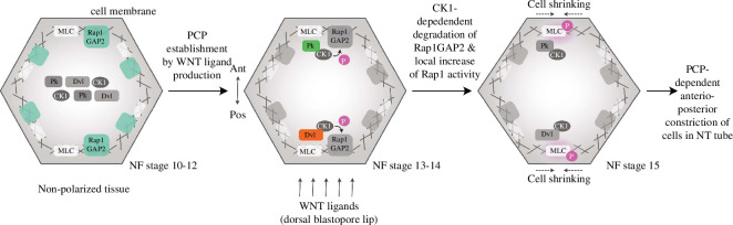 Figure 7. . A suggested mechanism of PCP-dependent activation of cell contractility through the binding of cytoplasmic PCP proteins prickle (Pk), dishevelled (Dvl) and casein kinase 1ε (CK1) to actomyosin proteins Rap1GAP2 and myosin light chain (MLC), leading to its phosphorylation (pMLC) through Rap1. This model is based on our experimental data in MDCK cells and in the neural plate of Xenopus embryos. We suggest that the key event in this process is the right balance of pMLC levels, which are regulated by cytoplasmic PCP proteins. Data about the dorsal blastopore lip, WNT ligand secretion and PCP establishment are demonstrated elsewhere (see the accompanying text).