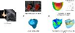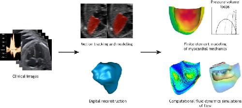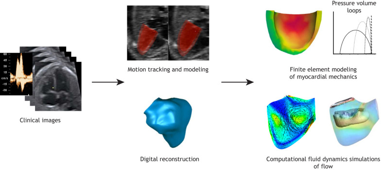 Fig. 4. Computational simulation of the human fetal heart. Summary of the steps involved in in-silico modeling based on biomechanics derived from clinical ultrasound images. From left to right: Images are first processed to reconstruct the anatomy of the relevant cardiac structures. Motion tracking and modeling, as well as digital reconstruction can be carried out to accurately extract and mathematically model their motion. This is followed by finite element modeling of myocardial mechanics to understand myocardial stresses and strains, and to evaluate cardiac function under hypothetical conditions. Computational fluid dynamics can be simulated to reveal details of flow patterns and forces. Clinical and computational reconstruction images captured and developed by C.H.Y.