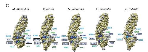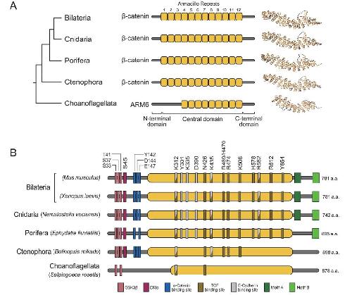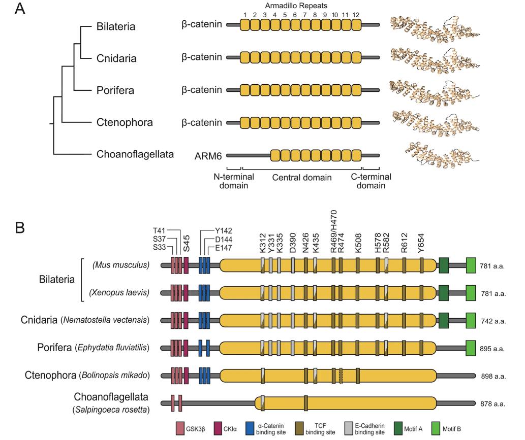 Fig. 2Primary and 3D structures of nonbilaterian β-catenins. (A) Overview of phylogeny and structure of β-catenins of early-branching (nonbilaterian) metazoans and ARM6 protein of the unicellular sister taxon, Choanoflagellata. (B) Domain organizations of β-catenin proteins. Metazoan β-catenins show a high degree of conservation of the central region, GSK3β/CK1α phosphorylation sites, and αE-catenin binding sites. At the C-terminus, motif A is conserved in only Bilateria and Cnidaria, whereas motif B is shared among all metazoan lineages, except for Ctenophora. In the choanoflagellate, Salpingoeca rosetta, possible GSK3β phosphorylation sites (S33/T41) were identified. (B) Surface depictions of β-catenin homology structural models were compared with mouse β-catenin. This confirmed that the three crucial arginine residues (dark blue) of nonbilaterians were localized similarly to mouse and Xenopus β-catenins. K556, R551, and K590 of B. mikado β-catenin were located at positions corresponding to mouse β-catenin R474, R469, and K508, but the R582, H578, R612, and Y654 assembly of mouse β-catenin is completely absent in B. mikado β-catenin. Structures visualized using UCSF Chimera software |