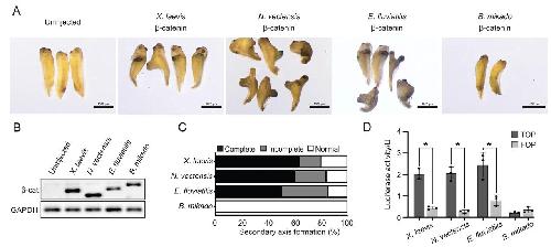 Fig. 3Xenopus secondary axis induction by nonbilaterian β-catenins. (A) Cnidarian (N. vectensis) and poriferan (E. fluviatilis) β-catenins (100 pg mRNA) induced a secondary body axis similar to that induced by Xenopus β-catenin. Ctenophore (B. mikado) β-catenin showed no inductive activity. (B) Western blot analysis of Flag-tagged β-catenins confirmed the expression of nonbilaterian β-catenin proteins in Xenopus embryos. (C) The majority of secondary body axes induced by injection of X. laevis (n = 24), N. vectensis (n = 20), and E. fluviatilis (n = 18) β-catenin mRNAs (100 pg) were complete (the second axis had a pair of eyes and a cement gland). This was followed by incomplete axis inductions in which head features were not fully developed. Secondary axes were not observed in embryos injected with B. mikado β-catenin mRNA (100 pg) (n = 19). (D) Expression of X. laevis, N. vectensis, and E. fluviatilis FLAG-tagged β-catenin mRNA (100 pg) in Xenopus embryos resulted in a significant increase in β-catenin TOPflash activity. No detectable level of TOPflash activation was observed by expression of B. mikado β-catenin. Asterisks denote statistical significance P < 0.0001 (Two-way ANOVA). This result was reproduced in two independent experiments |