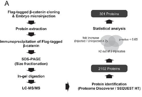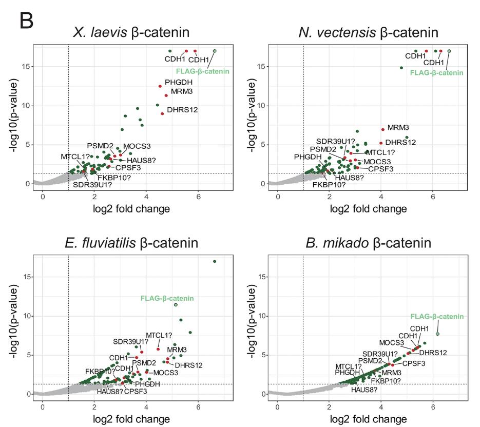 Fig. 4Precipitation of β-catenin interacting proteins. (A) Scheme of our IP-MS analysis of β-catenin protein complexes. (B) Mass spectrometry volcano plots resulting from analysis of enriched metazoan FLAG-tagged β-catenins expressed in Xenopus embryos. High confidence proteins (1% FDR), with a fold abundance ratio ≥ 2 and P < 0.05, were considered “true” interactions |