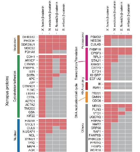 Fig. 5Potential evolutionarily conserved β-catenin interactions. Several proteins, e.g., CDH1, ARVCF, CTNNA1, that interact with β-catenin mainly in bilaterian models, formed complexes with basal metazoan β-catenins. Furthermore, new interactions were identified that may shed additional light on functional evolution of β-catenin protein machinery in metazoans |