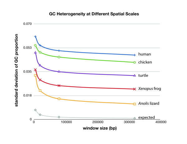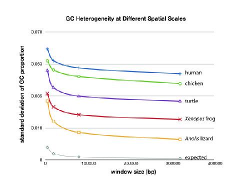 Figure 1. Standard deviation of GC content at different spatial scales. Genomes were partitioned into non-overlapping windows (5-, 20-, 80-, and 320-kb). As window size increases, variation in GC content naturally decreases. The western painted turtle exhibits a pattern consistent with high variation in nucleotide composition at smaller scales, rather than sustained isochoric variation at larger scales seen in mammals and birds. The expected pattern of decreasing standard variation assumes a compositionally homogeneous genome with a mean GC proportion of 0.41.