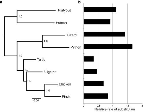 Figure 2. A revised phylogeny of major amniote lineages and their rates of molecular evolution. (a) Bayesian phylogram depicting the relationships of the eight primary amniote lineages, and their rates of molecular evolution. The phylogeny demonstrates the sister group relationship of turtle and archosaurs (allligator plus birds). The numbers at nodes denote posterior probabilities (all are at the maximum of 1.0). (b) The histogram shows the relative rate of substitution inferred for each lineage under a relaxed clock. For analysis details, see Materials and Methods, Phylogeny and substitution rate).