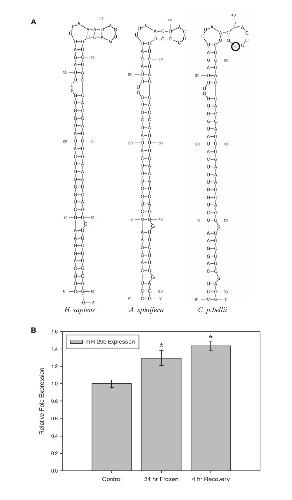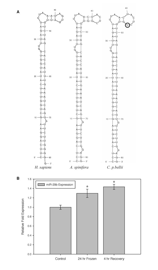 Figure 3. Western painted turtle miR-29b and response to freezing. (a) Nucleotide sequence and predicted secondary structure of pre-miR-29b transcripts from H. sapiens, A. spinifera, and C. p. bellii at 25 C. Nucleotide substitution which leads to differential terminal stem-loop formation that is unique to C. p. bellii is circled. (b) Relative expression levels of miR-29b as assessed by quantitative RT-PCR in liver samples of hatchling western painted turtles under control (5°C acclimated), 24 h frozen (at -2.5°C), or 4 h thawed (at 5°C) conditions. Data are means ± s.e.m. (n = 5 different animals). Parallel analysis of 5S rRNA found no significant changes between control and experimental conditions for this reference RNA. * Significantly different from the corresponding control (P <0.05).
