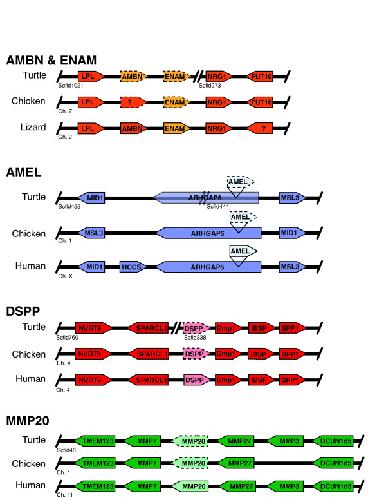 Figure 4. Conserved syntenic regions containing tooth-specific genes across toothed (human, anole) and edentulous (turtle, chicken) vertebrates. AMBN and ENAM are in a reptile-specific chromosomal region, precluding the use of human as a reference sequence for these genes. Dashed outlines indicate pseudogenization.