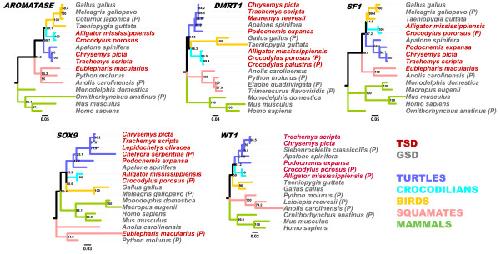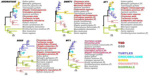 Figure 5. Maximum likelihood estimates of the phylogenetic relationships among taxa for five genes involved in gonadogenesis. Branch lengths are proportional to the number of substitutions per site; numbers at nodes are bootstrap proportions based on 500 pseudoreplicates. Colored branches denote the taxonomic group for each taxon. Tip font colors denote sex-determining mechanisms (red = TSD, gray = GSD). For all species, the full coding region was utilized except where only partial sequences were available, in which case the tip is denoted as (P).