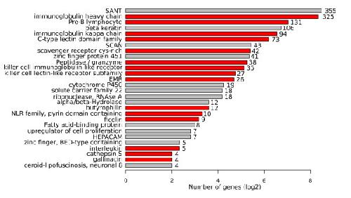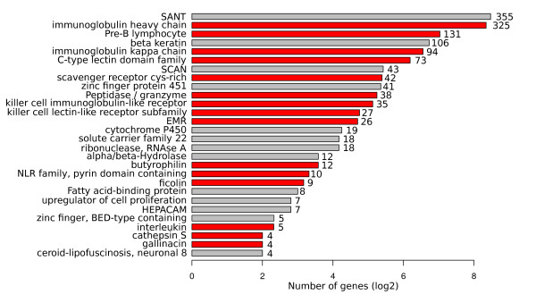 Figure 6. Gene families showing expansion in the western painted turtle lineage. The number of genes within a family is provided in front of each bar. Gene families associated with the immune response are shown in red.